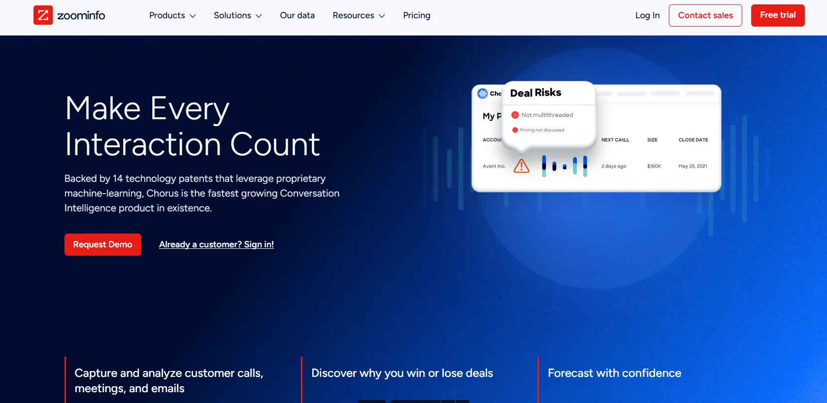 Chorus is Gong's main rival, and since ZoomInfo bought them, they have a secret weapon: data. Because it's plugged into ZoomInfo, it knows exactly who is in the meeting and what their role is. It’s great for analyzing talk tracks to see why your top performer closes deals and the new guy doesn't.