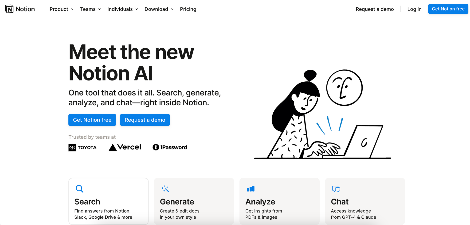 Notion has grown from a simple note-taking app into a powerhouse of project management and team collaboration. With AI features built right in, it's even easier to organize, write, and find information. You don't need to jump between different apps or learn complex commands - everything happens right where you work.
