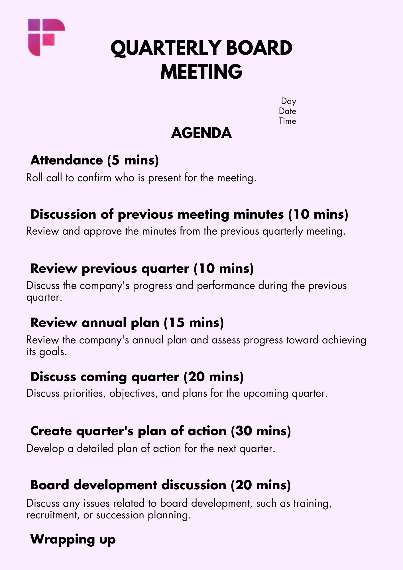 7. Quarterly board meeting agenda template