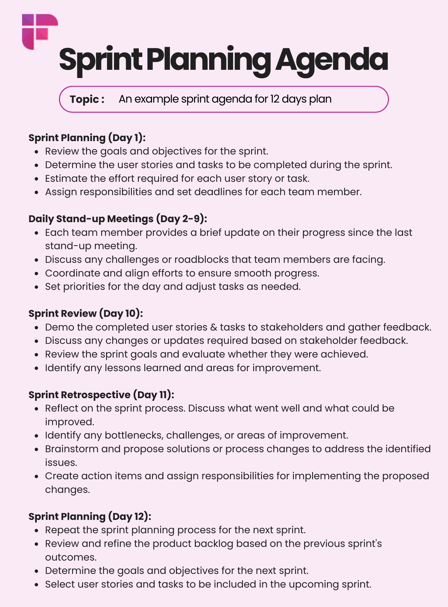 Remember, the length and structure of your sprint agenda may vary depending on your team's preferences, project complexity, and the duration of your sprints. It's essential to adapt and customize the agenda to suit your specific needs and goals.