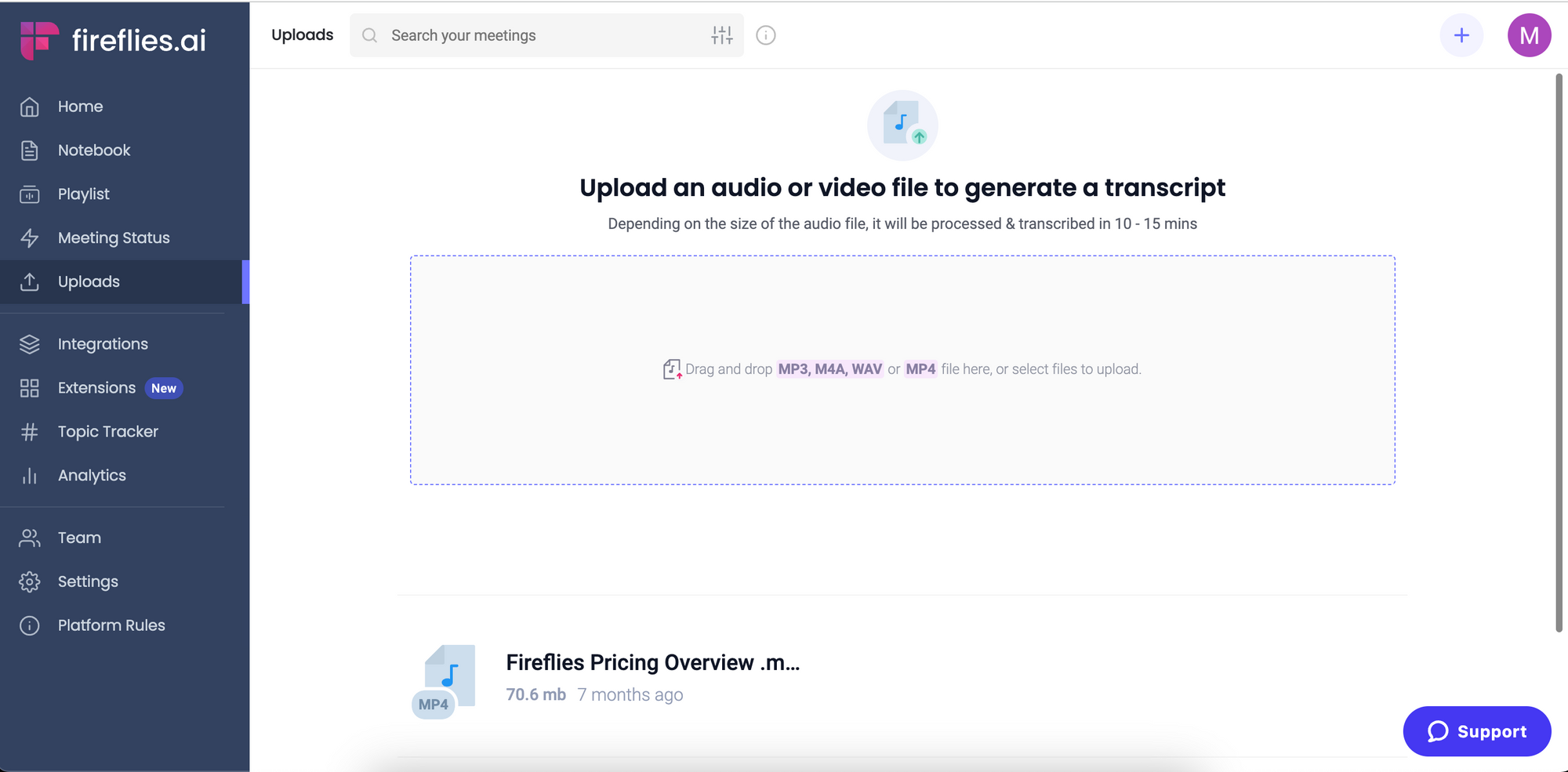 - To upload a file, log into your Fireflies account and go to Uploads.