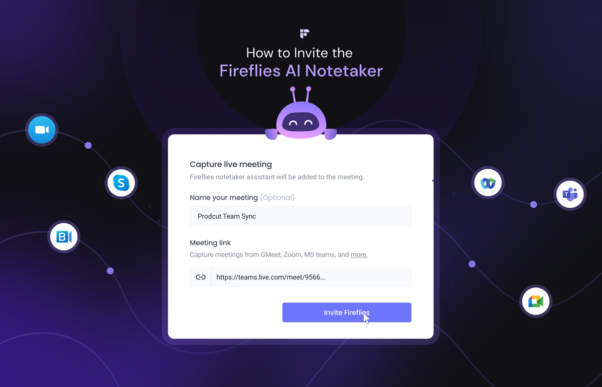 Record your virtual meetings: Don’t just record voice memos and offline conversations. Invite Fireflies to record and transcribe your online meetings on video conferencing platforms. Fireflies integrates with 8 platforms, including Google Meet, Zoom, Microsoft Teams, Webex, and more.