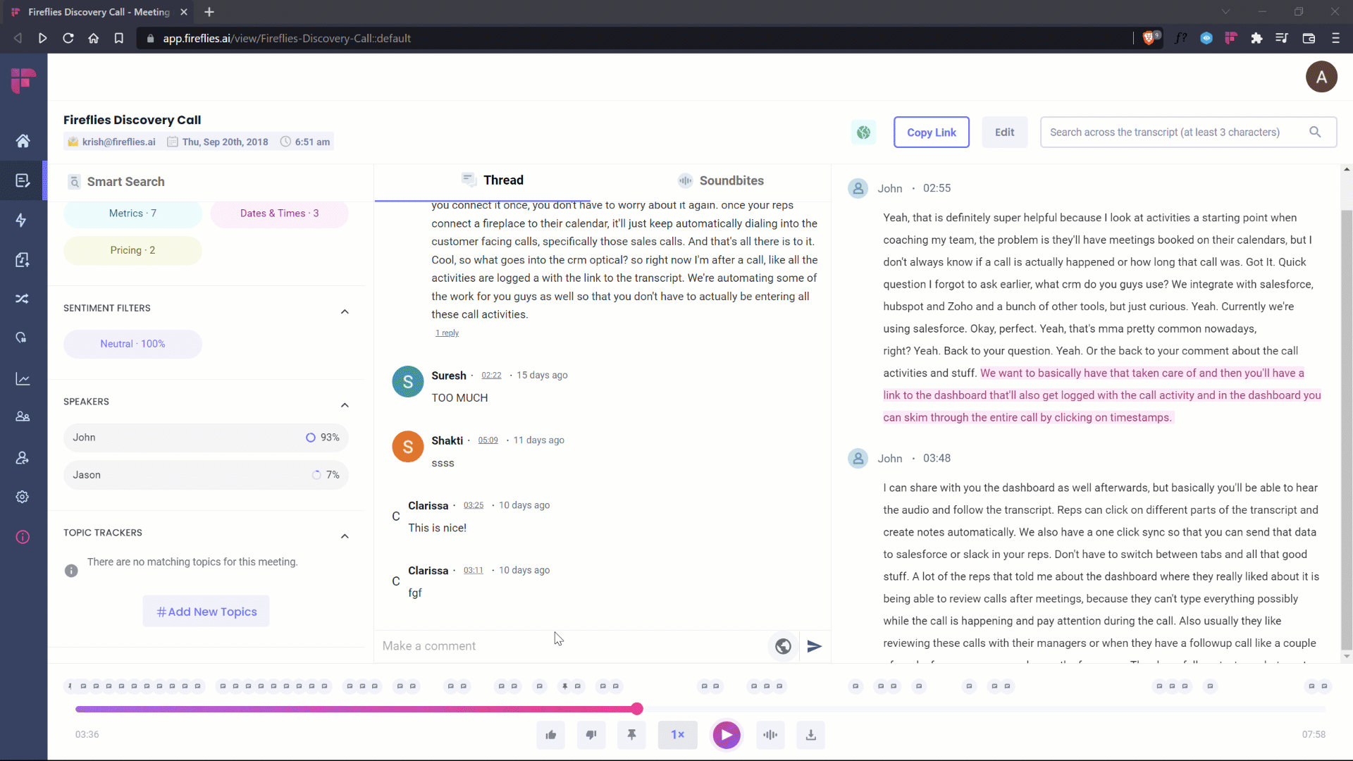 Annotate or leave comments on transcripts to allow your teammates to review them later.