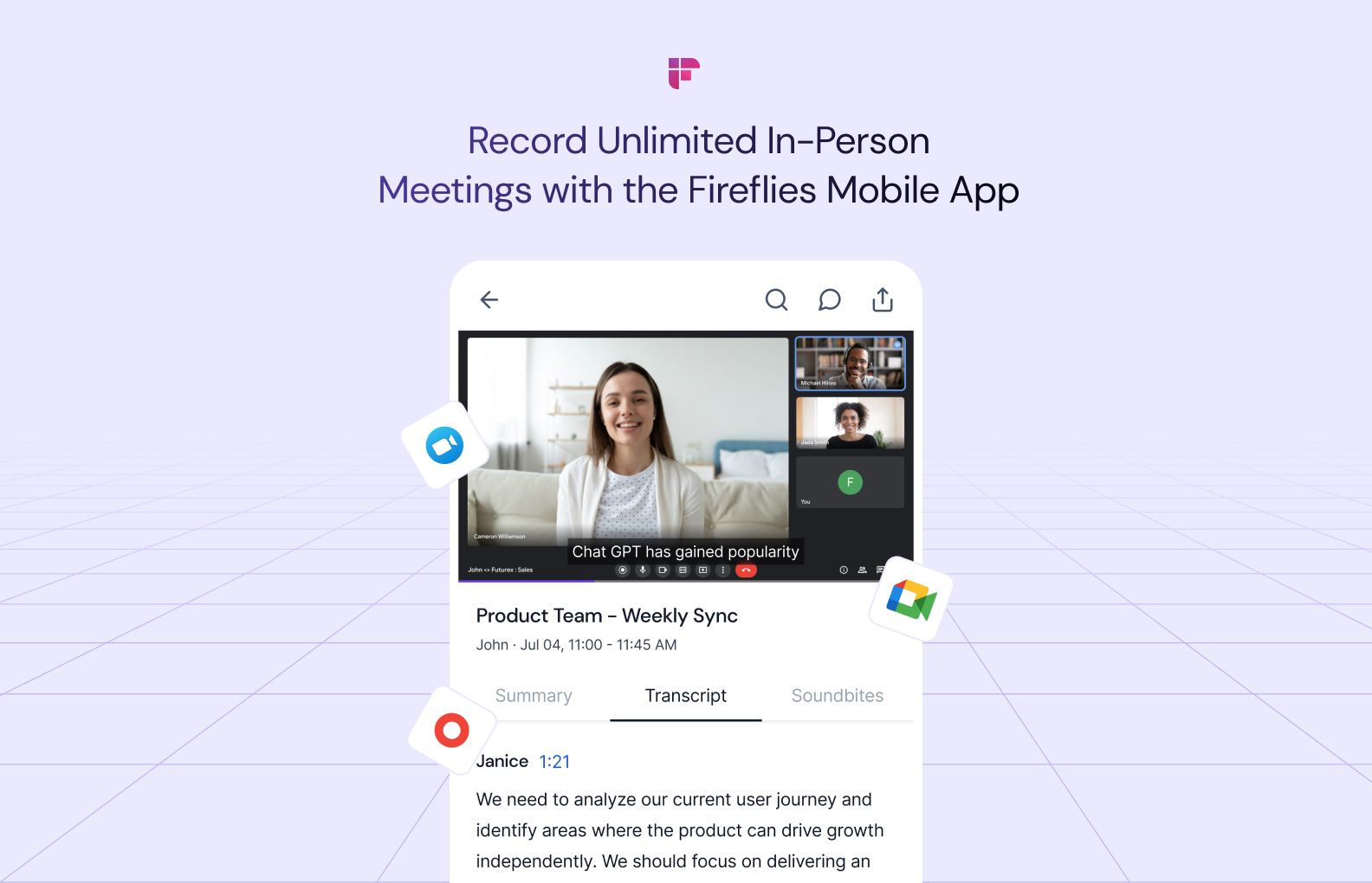 Invite Fireflies to seamlessly join, record, transcribe, and summarize your Zoom meetings. Plus, enjoy the convenience of recording and transcribing offline meetings, conversations, or voice memos.