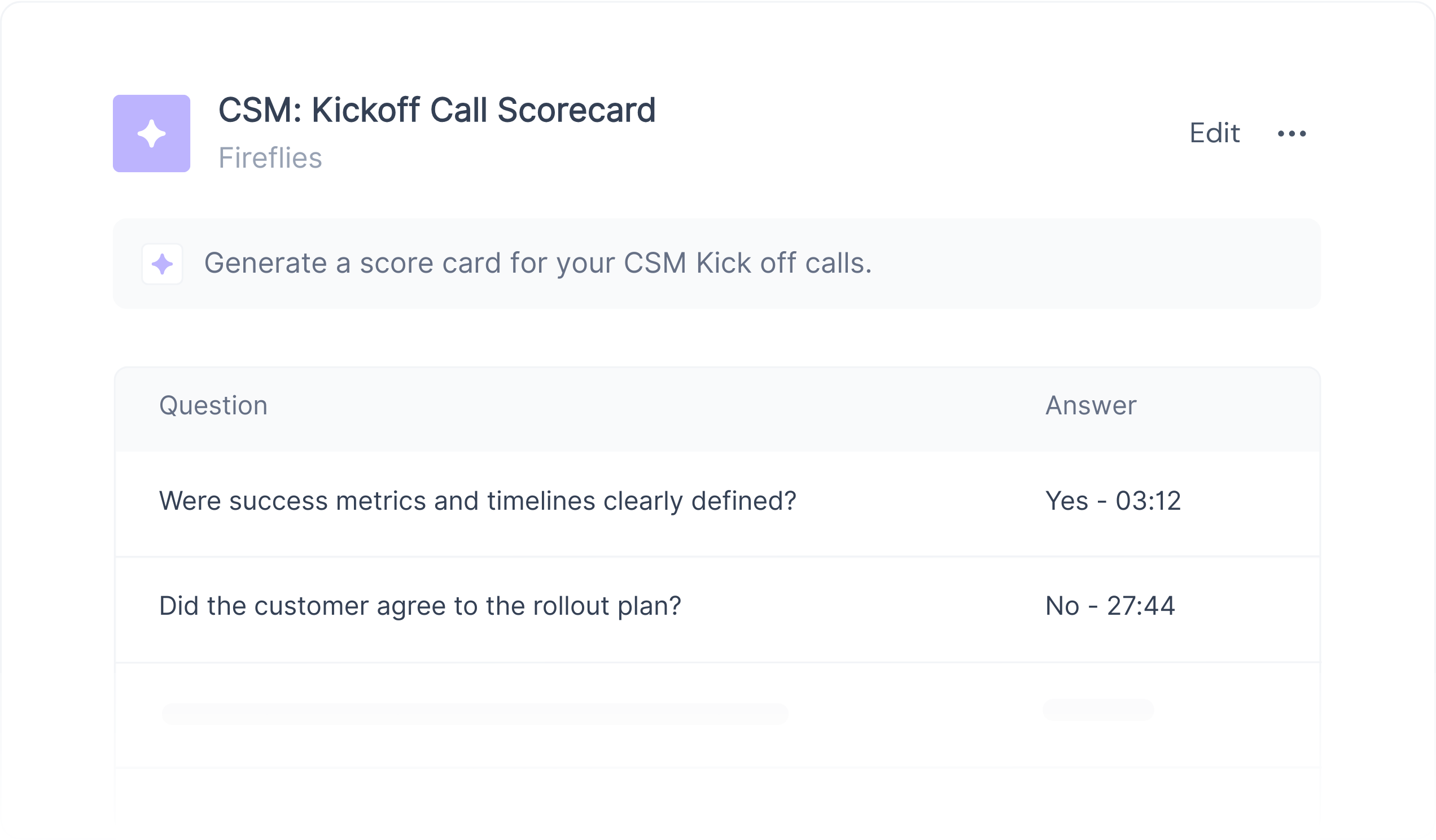 Know if your kickoff calls hit all key points. Get simple yes/no answers about agendas, timelines, priorities, and next steps - with exact timestamps.