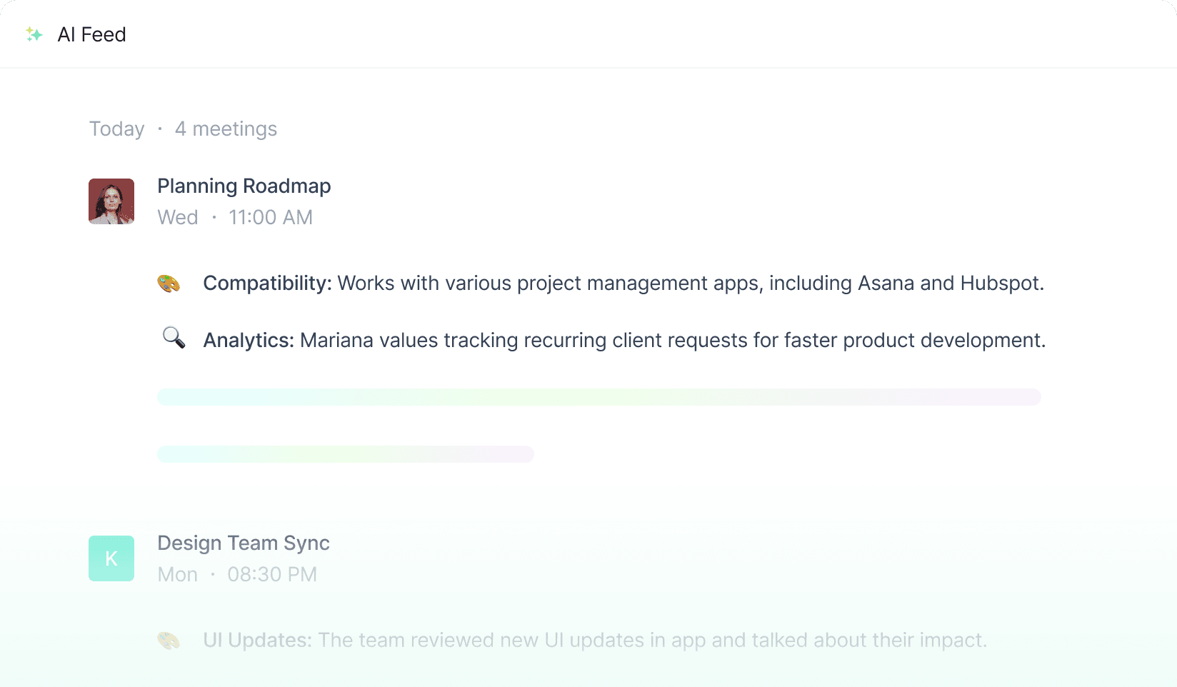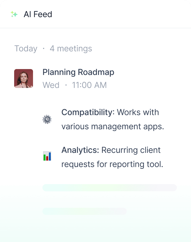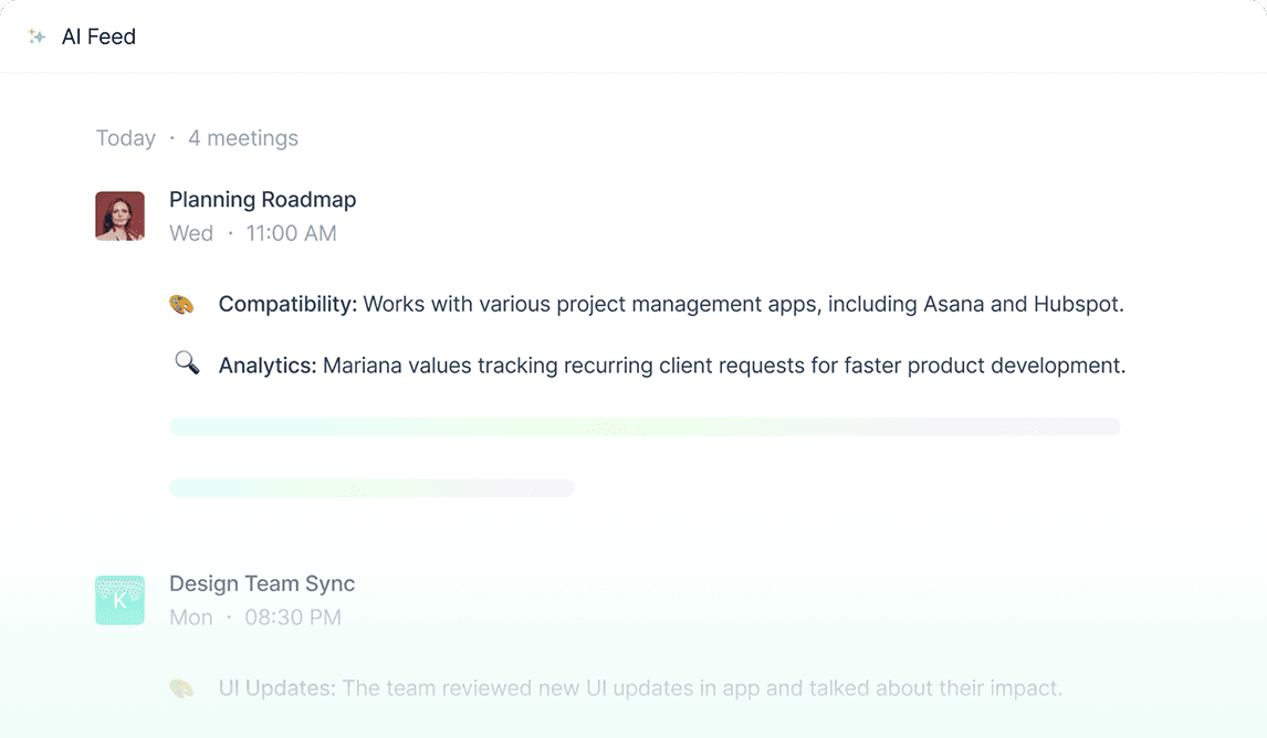 Stay on top of your meetings with a dynamic feed that highlights recent conversations and key topics discussed.