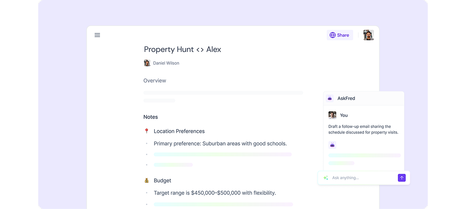 Get instant answers to questions about past property discussions, client preferences, or deal progress with AskFred.