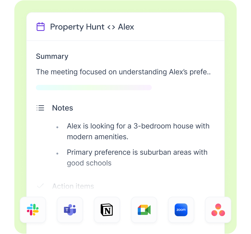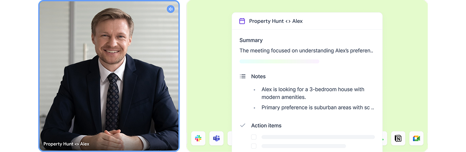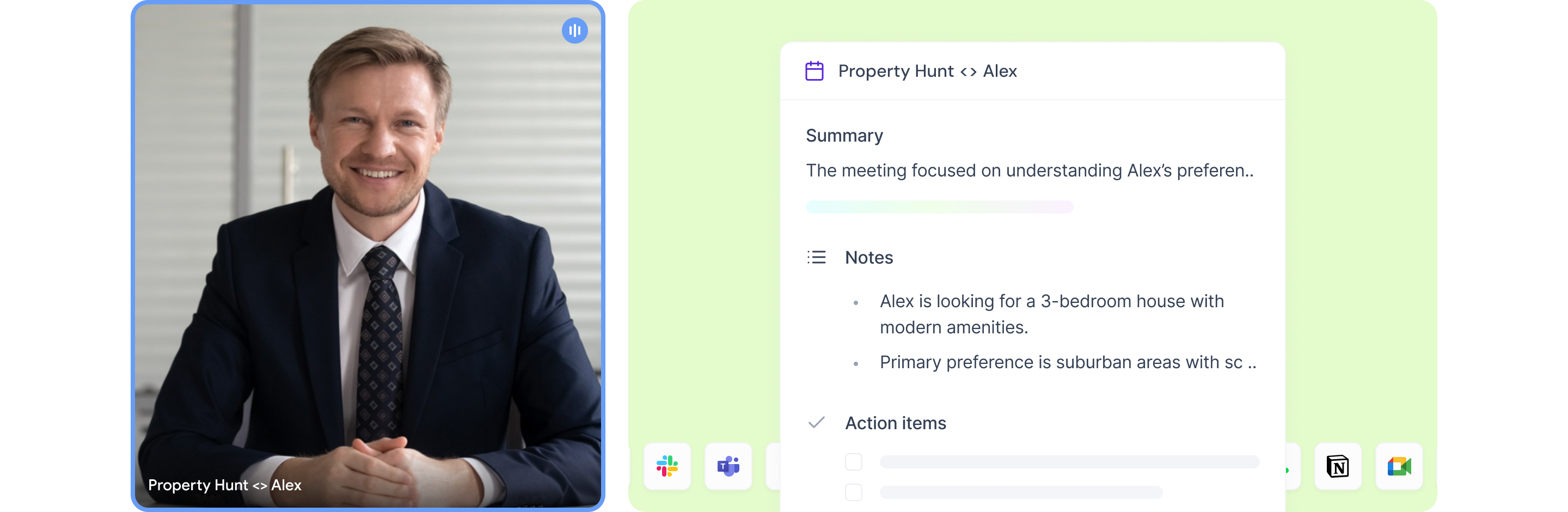 Automate client meeting notes, capture property discussions, and streamline follow-ups for agents and brokers.